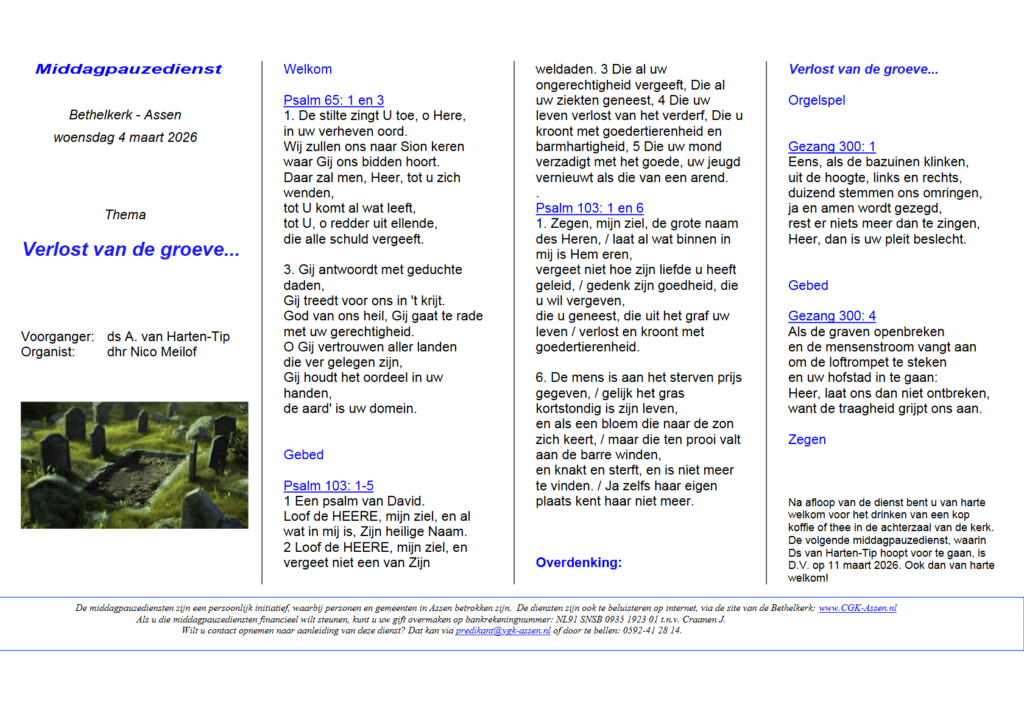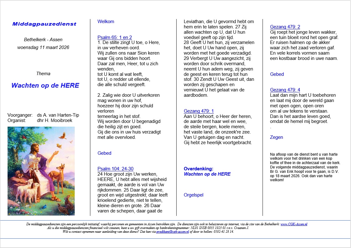 Elke woensdag in de Bethelkerk van 12.30 tot 12.50 uur. Fysiek in de Bethelkerk, maar ook online mee te beleven.